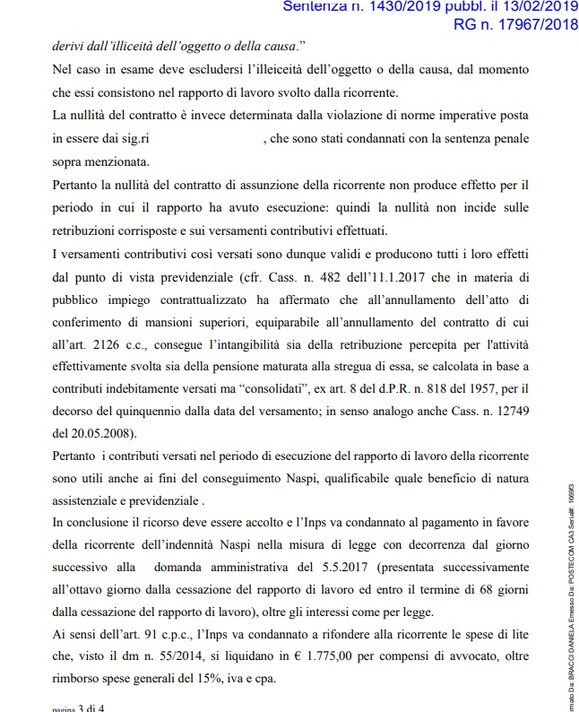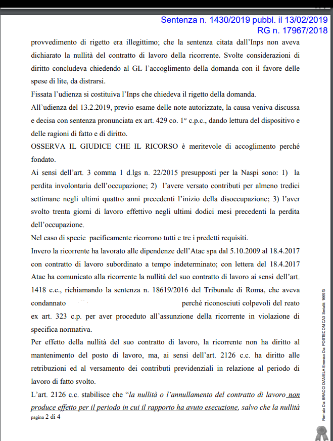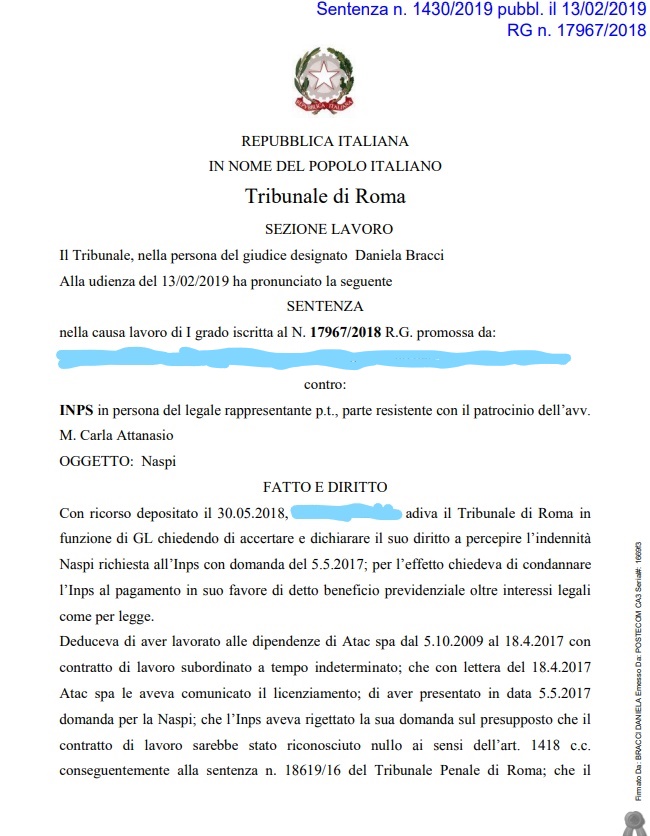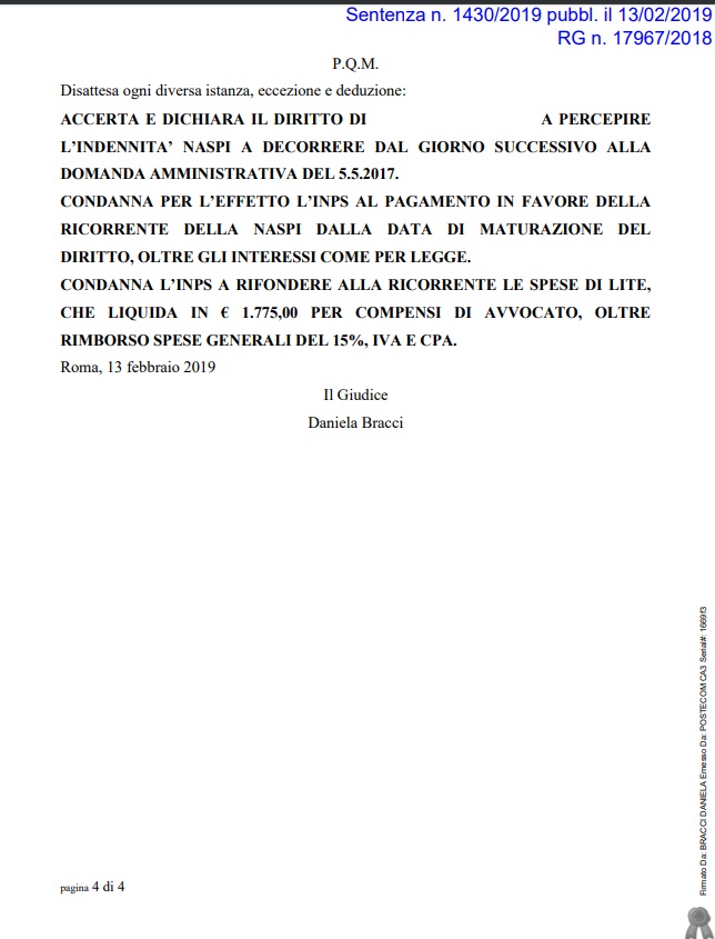 Pertanto, la sentenza del giudice Daniela Bracci del Tribunale di Roma ha condannato l’INPS al pagamento – in favore della ricorrente – della Naspi più gli interessi, spese di lite, compensi degli avvocati e spese di rimborso generali.