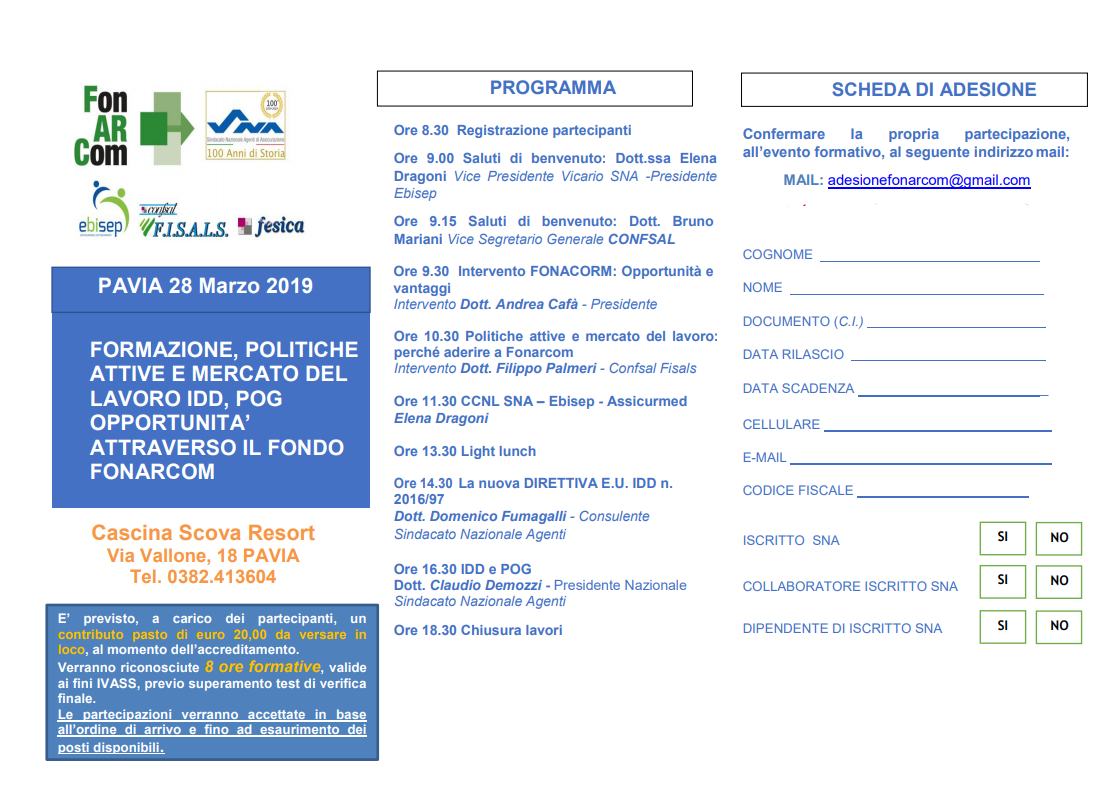 Giovedì 28 Marzo si terrà a Pavia presso il Cascina Scova Resort di Via Vallone 18, “Formazione, Politiche attive e mercato del lavoro Idd, Pog opportunità attraverso il fondo Fonarcom”, l’appuntamento organizzato da Sna, Ebisep, Fisals Confsal, Fesica Confsal e Fonarcom.
