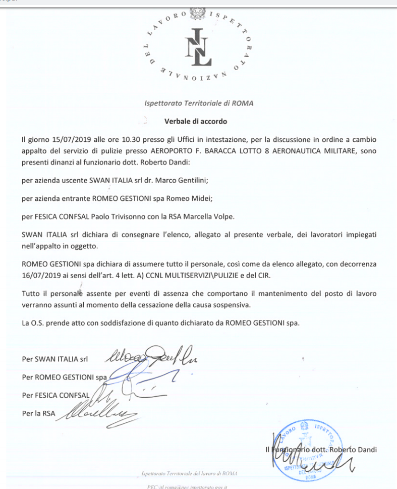 Si è svolta, presso l’Ispettorato del Lavoro di Roma, una riunione per esaminare gli aspetti occupazionali connessi con il cambio di appalto relativo al servizio di pulizia presso l’Aeroporto Baracca di Roma Centocelle.