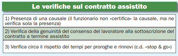 Raggiunta la durata massima di 24 mesi è possibile stipulare un ulteriore contratto a termine di durata massima di 12 mesi presso l’ispettorato del lavoro. Anche a tale contratto si applica l’obbligo d’individuare una causale; infatti, il ministero del lavoro ha chiarito che «mantengono quindi validità le indicazioni a suo tempo fornite da questo Ministero con la circolare n. 13/2008 in ordine alla verifica circa la completezza e la correttezza formale del contenuto del contratto, nonché alla genuinità del consenso del lavoratore alla sottoscrizione dello stesso, senza che tale intervento possa determinare effetti certificativi in ordine all’effettiva sussistenza dei presupposti giustificativi richiesti dalla legge» (circolare n. 17/2018).