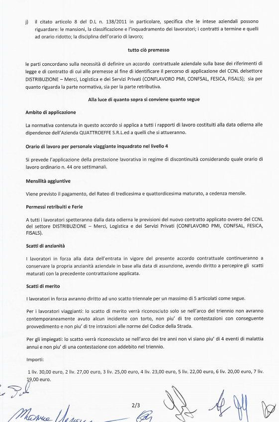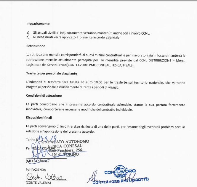 E’ stato sottoscritto un accordo aziendale di armonizzazione per normare vari elementi contrattuali, tra cui gli scatti di merito e le trasferte. E’ quanto apprendiamo da Sabina Metta, Segretario provinciale Fesica Confsal di Torino, dopo che un’azienda di autotrasporti ha deciso di adottare il CCNL Trasporti Fesica Confsal – Conflavoro Pmi (vedi) sostituendolo con quello sottoscritto da Cgil, Cisl e Uil.