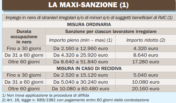 Le sanzioni per i datori di lavoro. L’ipotesi sanzionatoria è praticamente una: occupare in nero soggetti beneficiari del sussidio. Il caso è trattato come «aggravante» della maxi-sanzione per lavoro nero, con calcolo della sanzione in misura maggiorata del 20% (si veda tabella giù). La disciplina sanzionatoria trova applicazione in tutti i rapporti di lavoro privati, con eccezione di quelli domestici. Nella nota prot. n. 7964/2019, l’Inl precisa che l’aggravante sanzionatoria (aumento maxi-sanzione del 20%) si applica «non solo nell’ipotesi in cui il lavoratore in nero sia l’effettivo richiedente del reddito, ma anche qualora lo stesso, pur non essendo il diretto richiedente, appartenga comunque al nucleo familiare che (…) risulta destinatario del beneficio». Si ricorda, peraltro, che, quando i lavoratori occupati in nero sono almeno il 20% della forza lavoro aziendale, c’è anche la sanzione della sospensione dell’attività d’impresa, per la cui revoca il datore di lavoro deve procedere alla regolarizzazione, anche contributiva, dei rapporti di lavoro sommersi. La recidiva. Vale la pena ricordare, infine, che gli importi delle sanzioni sono oggetto di ulteriore aumento in caso di recidiva del datore di lavoro. Ossia nel caso in cui, nei tre anni precedenti, il datore di lavoro sia stato destinatario di sanzioni, amministrative o penali, per gli stessi illeciti. Gli illeciti da prendere in considerazione (c.d. fondanti la recidiva) sono anche quelli commessi prima dell’entrata in vigore della legge di bilancio 2019 che ha previsto questa maggiorazione delle sanzioni, cioè prima del 1° gennaio 2019.