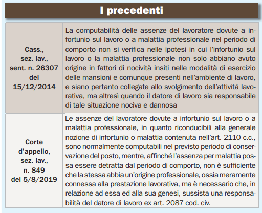 Le assenze dovute per infortunio o malattia professionale non sono computabili nel cosiddetto «periodo di comporto» qualora il datore di lavoro non osservi le regole in materia di salute e sicurezza nei luoghi di lavoro. Pertanto, laddove il lavoratore dovesse assentarsi dal lavoro per l’intera durata del periodo di comporto, in genere pari a 180 giorni, il datore di lavoro non può legittimamente procedere al licenziamento.