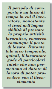 Il periodo di comporto. Il «periodo di comporto» è un periodo di tempo in cui il lavoratore, nonostante si trovi nell’impossibilità di prestare la propria attività lavorativa, conserva comunque il posto di lavoro. Durante tale arco temporale, quindi, il lavoratore gode di particolari tutele che non permettono al datore di lavoro di poter procedere con il licenziamento. Le uniche eccezioni, in tal senso, si hanno nel caso della giusta causa o in caso di giustificato motivo oggettivo, ossia il dipendente, per via della sua malattia che si è aggravata, risulti inidoneo alla mansione specifica.