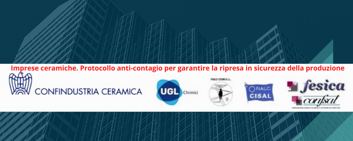 CONFINDUSTRIA CERAMICA e FESICA CONFSAL, UGL CHIMICI, FAILC CONFAIL e FIALC CISAL, in qualità di parti stipulanti il ccnl per gli addetti all’industria delle piastrelle di ceramica, di ceramica sanitaria, dei materiali refrattari, di porcellane e ceramiche per uso domestico e ornamentale, di ceramica tecnica, di tubi in grés, si sono incontrate in modalità telematica per assumere orientamenti comuni sulle misure da adottare negli ambienti di lavoro, nella prospettiva di coniugare la ripresa delle attività produttive con la fondamentale necessità di garantire ai lavoratori adeguati livelli di protezione, quando il Governo ne determinerà la possibilità e le condizioni.