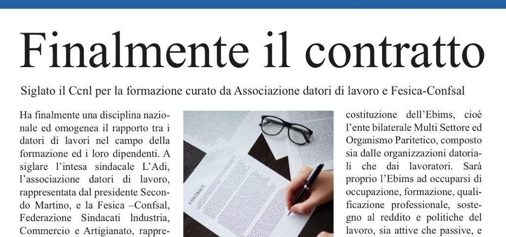 Ha finalmente una disciplina nazionale ed omogenea il rapporto tra i datori di lavori nel campo della formazione ed i loro dipendenti. A siglare l’intesa sindacale L’Adi, l’associazione datori di lavoro, rappresentata dal presidente Secondo Martino, e la Fesica Confsal, Federazione Sindacati lndustria, Commercio e Artigianato, rappresentata dal segretario generale Bruno Mariani. Preziosa l’assistenza della Confsal, la confederazione dei sindacati autonomi dei lavoratori.