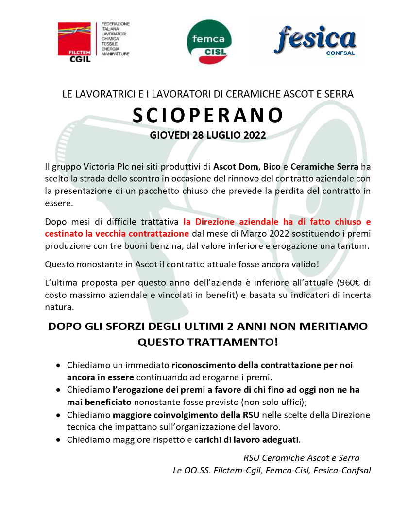 “Per questo, ma non solo per questo, giovedì 28 luglio 2022, i lavoratori delle ceramiche Ascot e Serra sciopereranno!”, concludono.