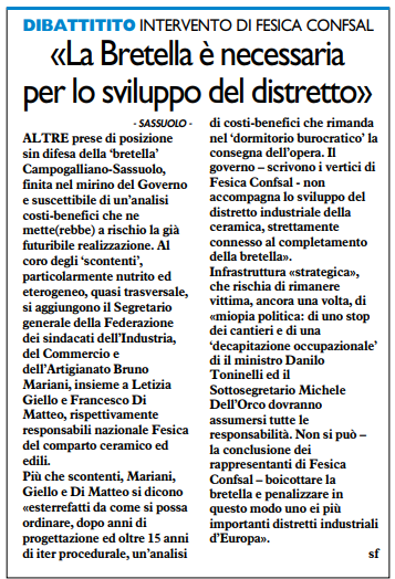 L’intervento di Fesica Confsal. “La bretella è necessaria per lo sviluppo del distretto” – 15 febbraio 2019 (Il Resto del Carlino)