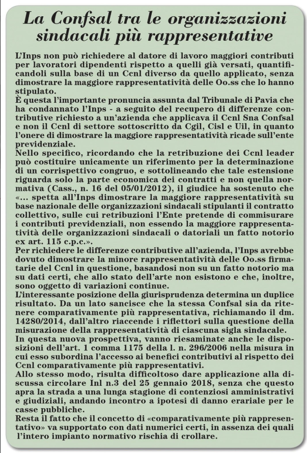 La Confsal tra le organizzazioni sindacali più rappresentative – 26 marzo 2019 (Italia Oggi)