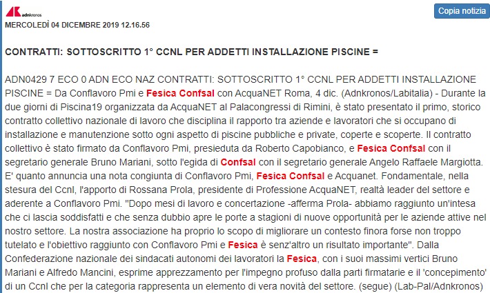 Contratti, sottoscritto il 1° Ccnl per addetti installazione piscine – 4 dicembre 2019 (AdnKronos)