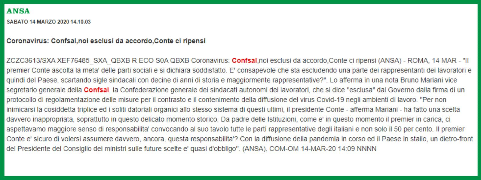 Coronavirus, Mariani (Confsal): “Noi esclusi dall’accordo, Conte ci ripensi” – 14 marzo 20 (ANSA)