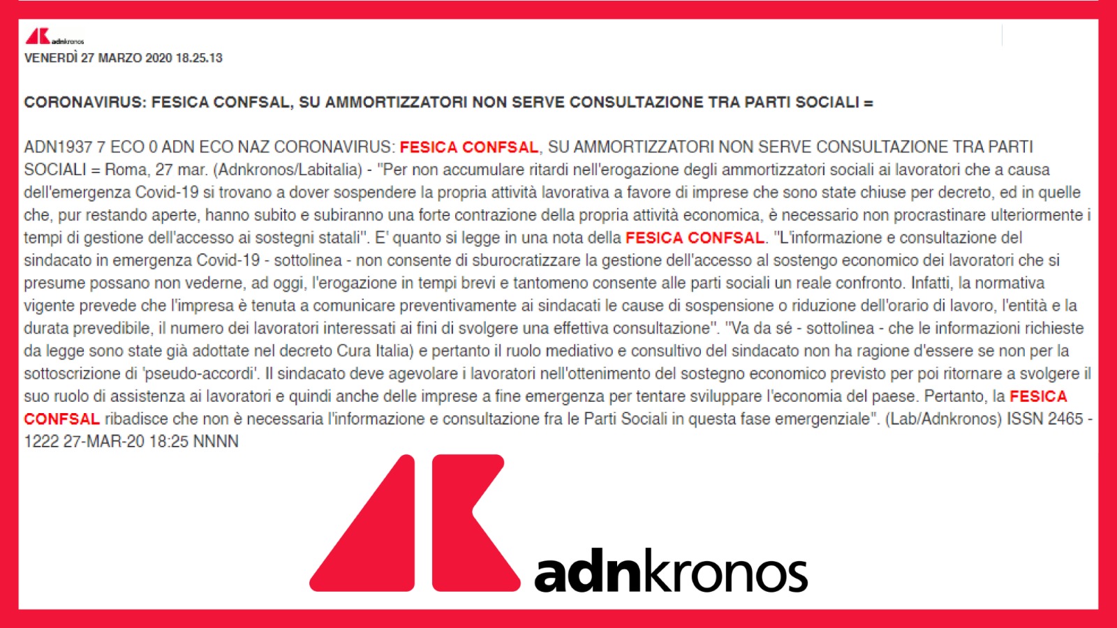 Coronavirus, Fesica Confsal: “Su ammortizzatori non serve consultazione tra parti sociali” – 27 marzo 2020 (AdnKronos)