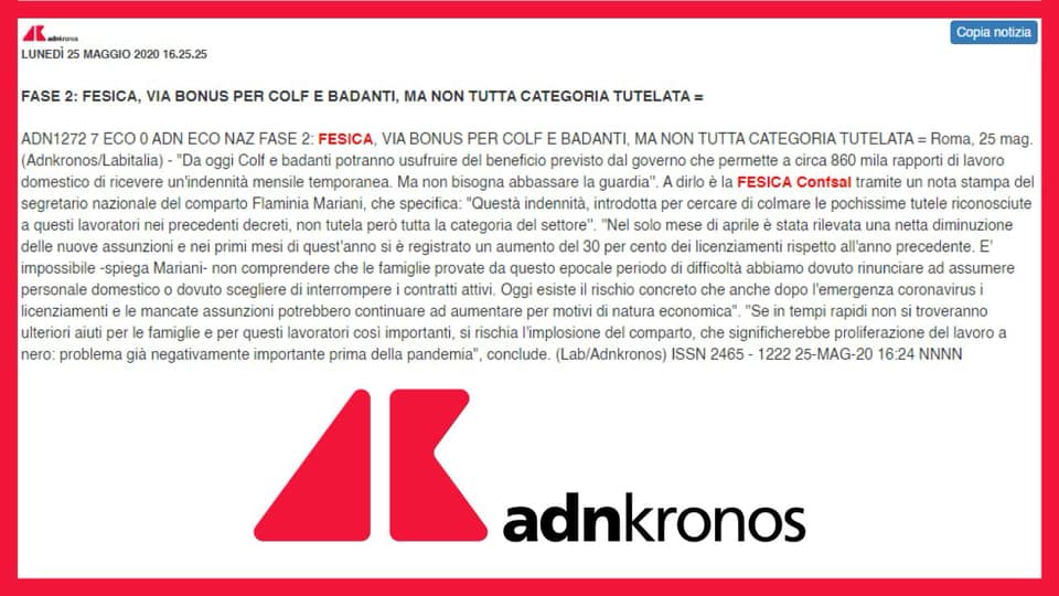 Fase 2: Fesica, via bonus per colf e badanti ma non tutta la categoria è tutelata – 25 maggio 2020 (AdnKronos)