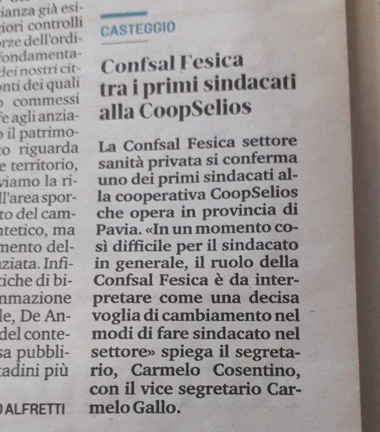 Casteggio. La Fesica Confsal tra i primi sindacati alla CoopSelios – 18 settembre 2020 (stampa di Padova)