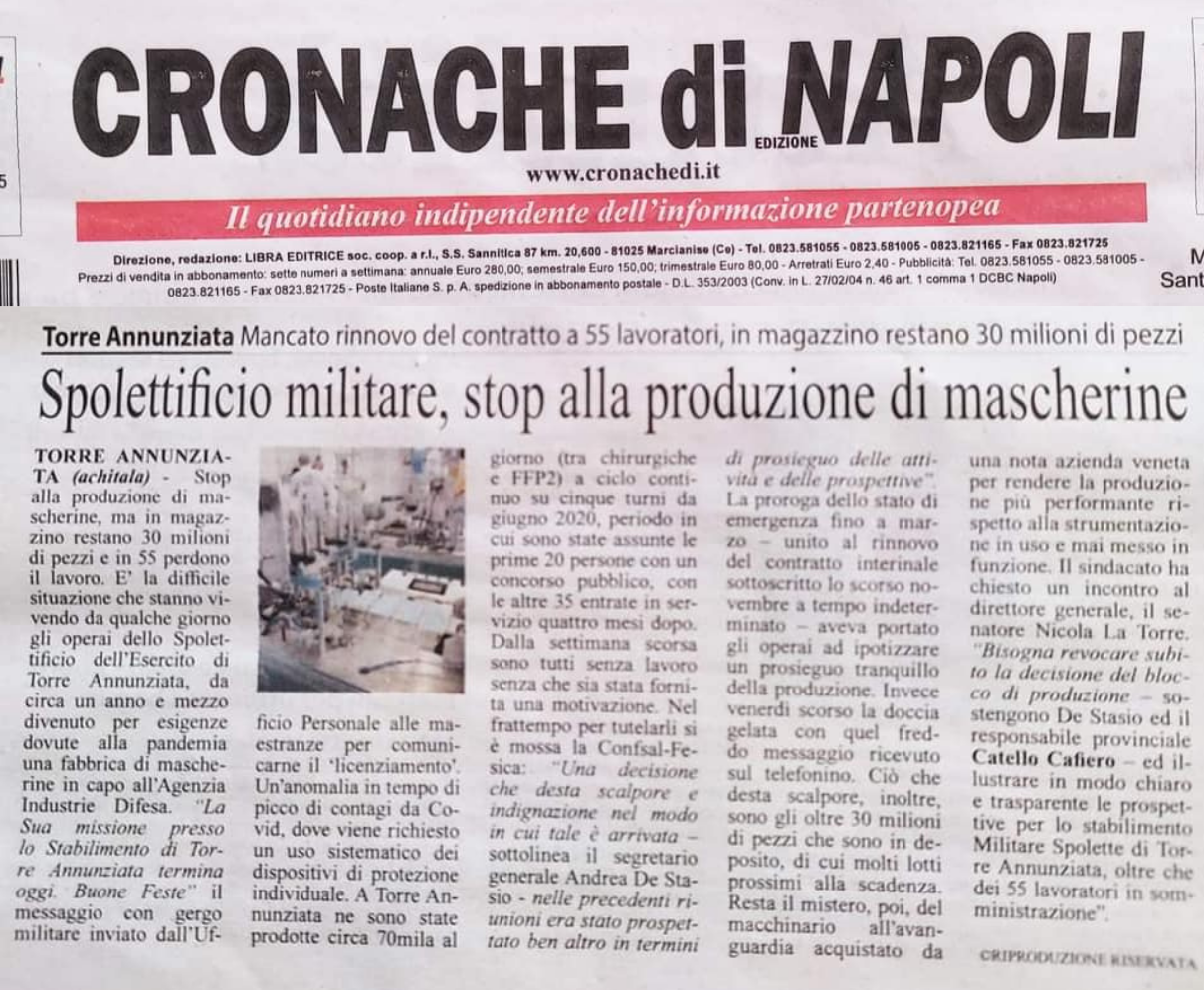 Spolettificio militare, stop alla produzione di mascherine. Mancato rinnovo del contratto a 55 lavoratori – 5 Gennaio 2022 (Cronache di Napoli)
