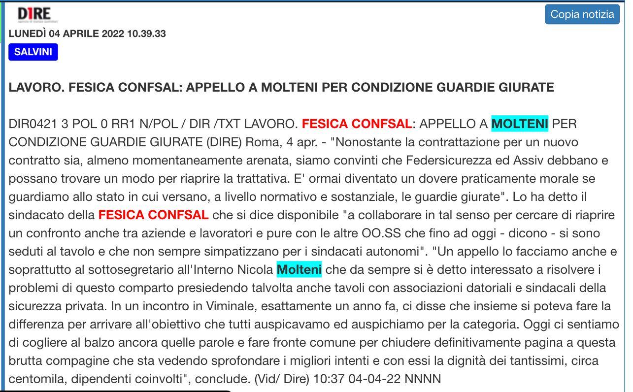 LAVORO. FESICA CONFSAL: APPELLO A MOLTENI PER CONDIZIONE GUARDIE GIURATE – 4 aprile 2022 [Agenzia DIRE]