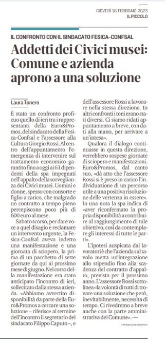 Addetti dei Civici Musei, il confronto con il sindacato Fesica Confsal – 16 febbraio 2023 (da IL PICCOLO)