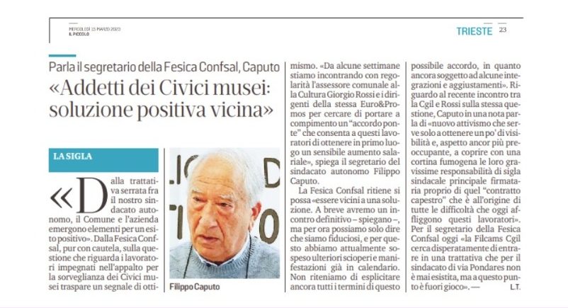 Parla il segretario della Fesica Confsal: “Addetti dei civici musei, soluzione dei civici musei vicina” (da I’l Piccolo’ del 15 marzo 2023)