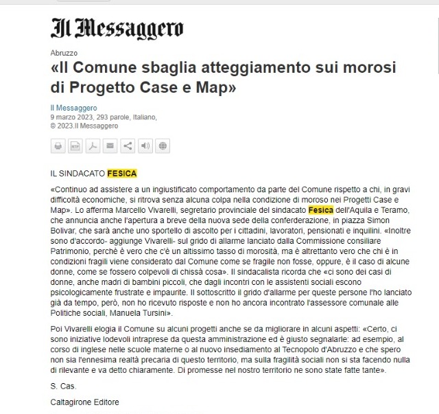 “Il Comune sbaglia atteggiamento sui morosi di progetto case e map”. Il sindacato Fesica (da Il Messaggero del 9 marzo 2023 )